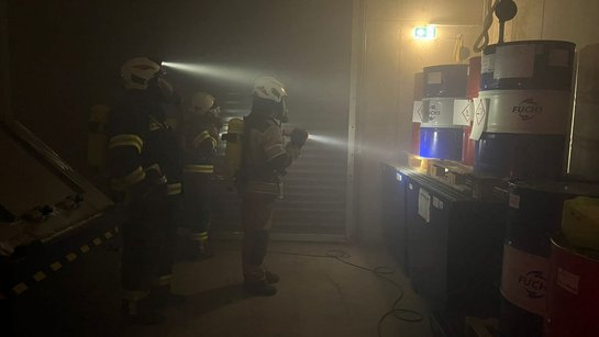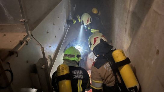 Parallel dazu stellte die Besatzung des LFB die Tragkraftspritze am Löschwasserbehälter auf und legte eine Zubringleitung zum Tank 1. Durch den eingesetzten Atemschutztrupp konnte der Brandherd rasch ausfindig gemacht und abgelöscht werden, zudem wurden die aufgefundenen Gefahrenstoffe dem Einsatzleiter gemeldet. Somit konnte der Fokus auf die Menschenrettung gelegt werden. Bei der Suche in dem verrauchten Objekt wurde die Person schließlich im Bunker aufgefunden. Damit waren alle Übungsziele erreicht und die Übung konnte erfolgreich beendet werden.